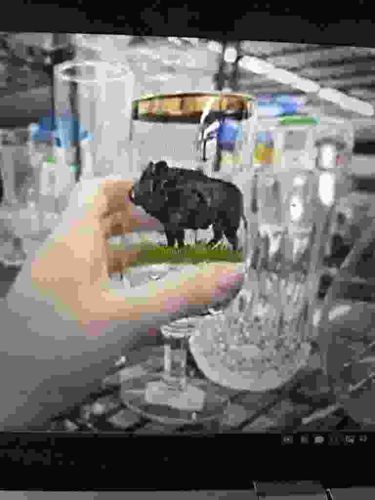 This item is a decorative stemmed glass, likely a wine or cordial glass, featuring a detailed wildlife motif. The central focal point is a hand-painted or enameled black wild boar standing upon a green grassy mound. The boar is rendered with a textured, matte finish, suggesting a high level of detail in the fur and anatomical structure. The glass itself appears to be of clear crystal or high-quality glass construction, featuring a gold-gilded rim that adds a touch of mid-century elegance. The stem is faceted with a multi-sided geometric cut, leading down to a wide, stable circular base. Based on the style and the use of enamel with gold leaf accents, this piece is likely of European origin, possibly German or Austrian (reminiscent of 'Moser' or 'Theresienthal' designs), dating between the 1950s and 1970s. The craftsmanship is evident in the precision of the animal's silhouette and the clarity of the glass. Condition appears good with no visible chips or cracks, although some typical thinning of the gold gilt on the rim can be expected with age. The use of hunting-related imagery classifies this as sporting art stemware, often sold in sets for display or formal use in lodge-style decors.