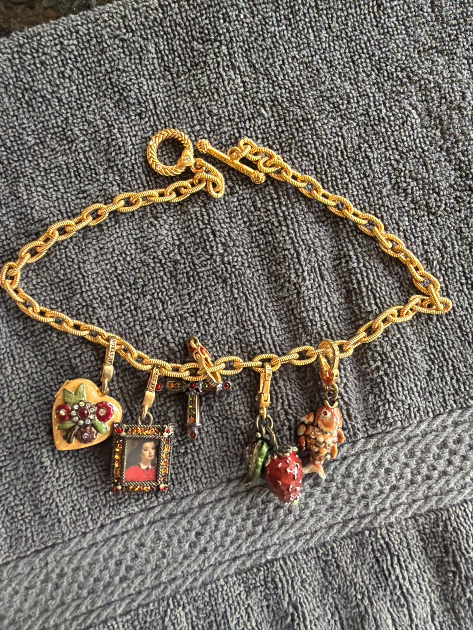 This is an authentic Jay Strongwater charm bracelet, a prime example of the brand's luxurious and whimsical aesthetic. The piece features a heavy-gauge, gold-tone textured rolo chain with a decorative toggle clasp closure. The clasp itself is intricately detailed with a rope-like texture and small inset crystals. The bracelet features five distinct, high-quality charms attached via branded lobster claw bails, each bearing the 'JAY STRONGWATER' stamp. The charms include a cream-colored enamel heart with floral motifs and crystals; a miniature rectangular portrait frame containing a classical image surrounded by amber crystals; an ornate jeweled cross with deep red and green stones; a realistic 3D strawberry charm with red enamel and green foliage; and a detailed koi fish charm with textured scales and warm-toned enameling. Each charm is crafted from brass with 18k gold-tone plating and finished with hand-applied Swarovski crystals and translucent enamels. The craftsmanship is evident in the fine detailing of the miniature figures and the precision of the stone settings. The item appears to be in excellent contemporary condition with minimal signs of wear, showing bright metal finishes and intact enamel and crystals. This piece likely dates from the late 1990s to the early 2010s, reflecting the era's trend for maximalist collector jewelry.