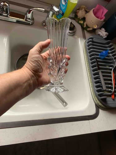 This is a vintage pressed glass bud vase, approximately 8 to 10 inches in height, featuring a clear, colorless glass construction. The design is characterized by a flared, scalloped rim that transitions into a long, vertical-ribbed neck. The mid-section down to the base features a more complex pattern of layered, chevron-style or 'wheat-ear' textures that create a geometric, tiered effect. The piece sits on a circular pedestal base adorned with radial starburst or sunburst cuts on the underside. The construction suggests it was made using a mold, as evidenced by the consistent patterns and likely presence of faint mold seams. The glass exhibits good clarity, suggesting it is a late 20th-century mass-manufactured decorative piece, possibly in the style of manufacturers like Anchor Hocking or Indiana Glass. The condition appears excellent with no visible chips, cracks, or significant clouding ('sick glass') from hard water deposits. Its slender silhouette is specifically designed to hold one or two flower stems, commonly referred to as a bud vase. The overall style is reminiscent of mid-to-late 20th-century Americana glassware, blending Art Deco geometric influences with traditional floral display functionality. No distinct maker's marks are immediately visible in the provided image, which is common for this type of utilitarian glassware.