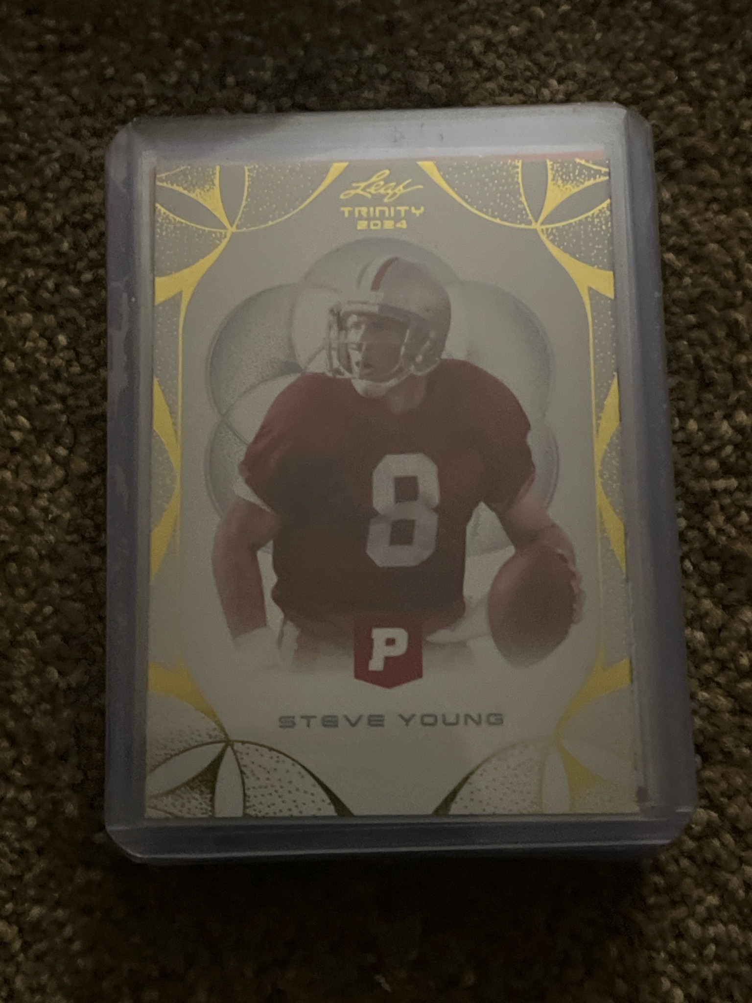 This is a 2024 Leaf Trinity football trading card featuring Hall of Fame quarterback Steve Young. The card is presented in a standard 2.5 by 3.5 inch format, constructed from thick premium cardstock with a high-gloss finish. The design features a white and gold color palette with intricate geometric 'clover' patterns in gold foil at the corners. Centered is a photographic image of Steve Young in action, wearing a red #8 jersey and a silver/red helmet, indicative of his college career at BYU. Below the image is the name 'STEVE YOUNG' in clean, dark sans-serif typography, accompanied by a small shield icon containing the letter 'P'. The top of the card bears the gold 'Leaf TRINITY 2024' logo. The card appears to be in excellent to near-mint condition, housed within a clear protective plastic top-loader sleeve which has some superficial scuffing, though the card itself shows no visible corner softing, edge wear, or surface scratches through the protector. This modern release by Leaf Trading Cards emphasizes high-end production values and classic sports aesthetic. The centering of the image and the crispness of the foil stamping indicate a high level of manufacturing craftsmanship.