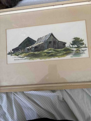 This item is an original horizontal rectangular watercolor painting depicting a rustic scene of weather-worn wooden barns set within a grassy landscape next to a singular tree. The artwork utilizes a muted, naturalistic color palette consisting of mossy greens, desaturated browns, grays, and deep blues for the shadows, executed with loose, expressive brushwork characteristic of 20th-century realism. The piece is signed by the artist, likely read as 'Shirley Paul Heitman' or a similar variation, in the lower left corner. The painting is professionally matted with an off-white or light tan mat board and housed in a modern, metallic-toned linear frame, possibly aluminum or wood with a champagne gold finish. Regarding condition, the paper shows minor signs of uniform yellowing consistent with age, though the colors remain vibrant. The frame shows slight surface wear and minor scuffing at the edges. The glass displays a reflection of the photographer but appears intact. Based on the signature style and framing materials, this piece likely dates from the 1970s to the 1990s, exhibiting a high level of technical proficiency in wet-on-dry watercolor techniques and textural rendering of aged wood.