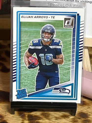This is a modern sports trading card designed in the style of the Panini Donruss 2021 football set. The card features Elijah Arroyo, identified as a Tight End (TE), wearing a Seattle Seahawks uniform. The construction consists of a standard 2.5 by 3.5-inch stiff cardstock with a matte white border and vibrant blue graphics. The center image shows a cut-out action shot of the player carrying a football, set against a blurred green field background. The card features the iconic 'Rated Rookie' logo in the bottom-left corner and the Donruss 'D' logo in the top-right. The Seahawks team logo is positioned in the bottom-right corner. Notable for its high-quality printing, the card appears to be in 'Near Mint' to 'Mint' condition, encased in a protective plastic top-loader and displayed on a black stand. The colors are crisp with no visible fading, corner dings, or surface scratches apparent through the protective sleeve. This specific item appears to be a customized or 'art card' creation, as player Elijah Arroyo is traditionally associated with college football (Miami) and is depicted here in a Seahawks jersey (number 18) which may not reflect an official pro-team assignment. The card's aesthetic faithfully replicates official Panini design elements, including the striped border patterns and typography.