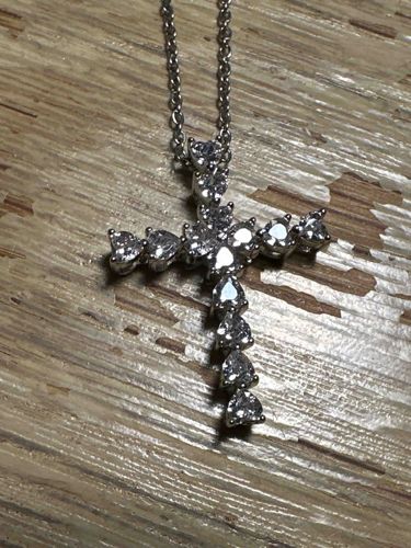 This item is a decorative cross pendant featured on a fine link chain. The pendant is meticulously constructed from multiple small, faceted stones, likely cubic zirconia or small diamonds, each cut into precise heart shapes. These stones are set in a bright white metal, which appears to be silver-toned, such as sterling silver, white gold, or rhodium-plated base metal. The cross is composed of eleven heart-shaped stones in total: one forming the bail/top, three across each horizontal arm, and four extending down the vertical limb. The settings are prong-style, which maximizes light entry into the stones for increased brilliance and fire. The overall aesthetic is contemporary and romantic, blending religious symbolism with feminine 'heart' motifs. The necklace chain is a delicate cable or faceted link style, commonly used in modern jewelry. Regarding condition, the metal surfaces show minor surface scratches and slight signs of wear consistent with regular use. There is no immediate evidence of missing stones or significant structural damage, though a professional cleaning would likely enhance the luster of the facets. The craftsmanship appears to be of mid-range commercial quality, commonly found in modern jewelry boutiques from the late 20th to early 21st century.