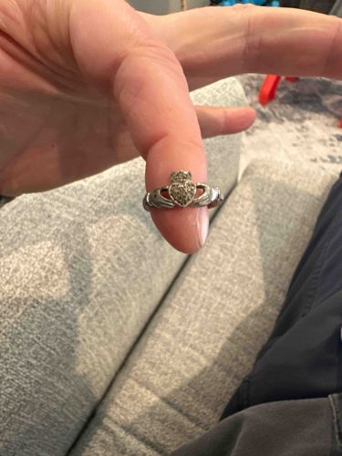 This item is a traditional Irish Claddagh ring, characterized by the iconic symbol of two hands clasping a heart topped with a crown, representing friendship, love, and loyalty. The piece is constructed from a silver-toned metal, likely sterling silver based on the color and common manufacturing standards for this style. The central heart is uniquely executed with a pave setting of small, clear stones—likely cubic zirconia or small diamond accents—giving it a textured, sparkling finish. The crown and hands feature cast detailing, with distinct finger definition on the hands and points on the crown. The band appears to be of standard width, tapering slightly toward the back. In terms of condition, the metal shows moderate surface wear including fine scratches and some slight tarnishing or buildup in the recessed areas between the stones and the ornamental casting. No hallmarks or maker's marks are visible from the primary angle, but they are typically found on the inside of the shank. The craftsmanship is consistent with modern commercial jewelry manufacturing, likely produced within the last 20-30 years. Overall, it is a classic cultural piece with a decorative gemstone twist.