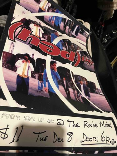 This is a promotional concert poster for the rock/nu-metal band (hed) p.e., featuring their signature stylized lowercase logo in bold red with white outlining. The poster's central imagery consists of a group photograph of the band members in an industrial setting, framed by circular, swooping white graphic elements. The bottom portion of the poster features a white border where event-specific details have been added in black hand-written marker. The text reads 'f*@'n Sh*t up at: @ The Roche Motel', '$11 Tue Dec 8 Doors: 6p'. A small logo for 'Jive' records (the band's label during their late 1990s era) is visible in the bottom right corner. Based on the band's lineup, the Jive Records logo, and the specific graphics, this item likely dates back to the late 1990s (circa 1998, as December 8th fell on a Tuesday that year). The poster appears to be printed on standard semi-gloss paper stock. Regarding condition, there is visible creasing across the surface and noticeable rippling, suggesting it has been rolled or handled frequently. The handwritten marker is a local addition common for street-team or venue promotions. The colors remain relatively vibrant, though the black background shows some minor surface scuffing characteristic of vintage paper ephemera.