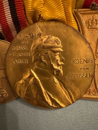 This is a German commemorative medal, known as the Kaiser Wilhelm Memorial Medal or Zentenarmedaille, established in 1897 to mark the 100th birthday of Kaiser Wilhelm I. The medal is circular and cast in yellow-bronze or 'gunmetal' sourced from captured enemy cannon. The obverse features a profile bust of Kaiser Wilhelm I facing right, wearing a Pickelhaube (spiked helmet), a military uniform, and a mantle. The inscriptions 'WILHELM DER GROSSE DEUTSCHER KAISER' (Wilhelm the Great German Emperor) and 'KOENIG VON PREUSSEN' (King of Prussia) are prominently displayed in relief. The piece shows a rich golden-brown patina consistent with late 19th-century bronze age. Condition is very good, showing light surface wear and minor oxidation flecks or 'foxing' typical for its age, with sharp detail still visible in the beard and the eagle scale armor of the mantle. The craftsmanship is high-quality, typical of the Berlin State Mint production of that era. This specific example appears to be an original issue, lacking some of the sharper modern restrike characteristics. It is partially obscured by ribbon remnants and sits amongst other military decorations, including a visible yellow ribbon and parts of a 1914 Iron Cross second class ribbon.