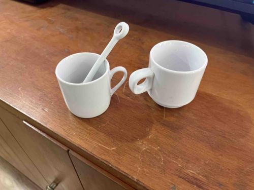 Pair of Modernist White Porcelain Espresso Cups and Stirring Spoon