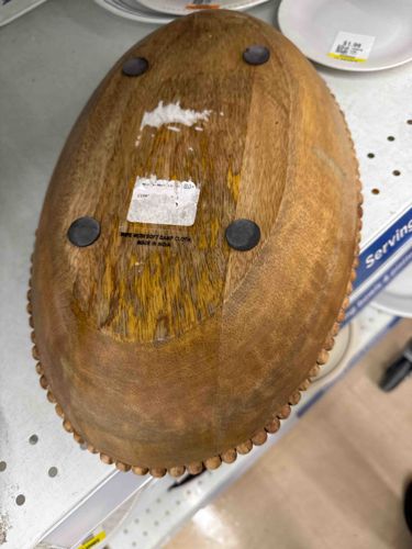 This item is a decorative oval-shaped serving tray or bowl, primarily constructed from a warm-toned mango wood. The piece is characterized by a distinctive beaded border that runs continuously along the upper rim, featuring small, uniform spheres of matching wood. On the underside, the tray sits on four circular, non-slip rubberized feet to prevent sliding and surface scratches. The object displays a prominent natural wood grain with varying shades of medium brown and amber. Notable markings include a printed stamp on the bottom that reads 'WIPE WITH SOFT DAMP CLOTH' and 'MADE IN INDIA,' indicating contemporary mass-market manufacturing rather than antique origin. Regarding condition, there is significant adhesive residue and a partially torn white paper label in the center of the base, along with some visible scuffing, minor loss of original finish, and dark staining on the wood surface, likely from previous use or moisture exposure. The craftsmanship reflects modern decorative home goods style, often sold in large retail home decor stores within the last 5-10 years.