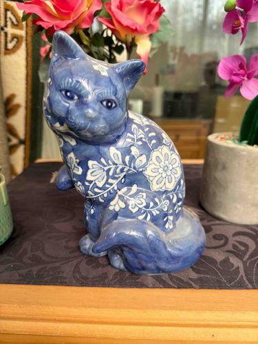 Blue and White Chinoiserie Ceramic Cat Figurine
