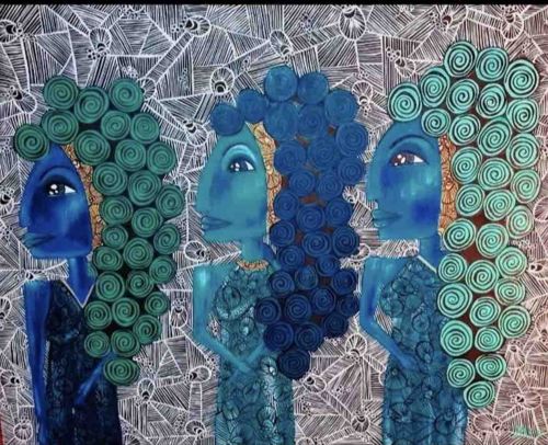This contemporary artwork features three stylized female figures set against a dense, intricate geometric background. The piece is characterized by its vibrant use of blues and teals, with the figures possessing exaggerated, profile-view facial features and large, spiraling, voluminous hair. The hair is constructed of tightly coiled circular patterns in varying shades of green, navy, and turquoise. Each figure wears a patterned dress or bodice that mirrors the complexity of the background. The background itself is a highly detailed monochromatic field of white line work on a dark base, creating a series of overlapping geometric shapes and hatch marks that provide significant texture and contrast. The overall style is reminiscent of neo-expressionism or modern folk art, utilizing heavy stippling and contouring on the skin of the figures to suggest depth. The craftsmanship appears precise, with consistent line weights in the background and smooth gradient blending on the faces. The condition of the artwork appears to be excellent with no visible surface abrasions, fading, or moisture damage. A small signature is visible in the lower right corner, though several details regarding the exact medium (likely acrylic or ink on canvas) would require a physical inspection to confirm. The piece reflects a modern stylistic era, likely dating from the 21st century.