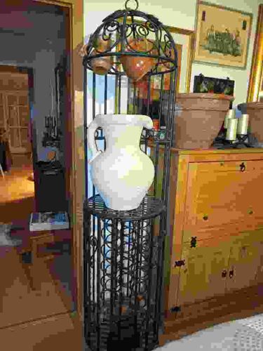 This item is a decorative floor display unit crafted from wrought iron, designed in a vertical cylindrical shape with a crown-like domed top. The structure features intricate scrollwork and vertical bars, finished in a dark, matte black or deep charcoal patina indicative of late 20th-century Mediterranean or Tuscan revival styles. Standing approximately five to six feet tall, the unit serves as a multi-tier showcase. The lower section appears to be a wine rack or densely patterned lattice base, while the middle tier features an open platform currently holding a large, matte-finish cream or off-white ceramic urn with a rounded body and substantial handles. The top domed section is uniquely used to hang smaller, amber-glazed terracotta pitchers or jugs by their handles. The metalwork shows signs of hand-forging or quality welding at the joints with no visible rust, suggesting well-maintained indoor use. The ceramic pieces included show a high-quality glaze with natural variations in color, though specific maker's marks are not visible from this angle. The overall craftsmanship suggests a high-end home decor piece intended for a sunroom, kitchen, or dining area to evoke a rustic, European estate aesthetic.