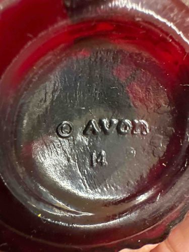 This item is a piece of ruby red pressed glass, characterized by its deep, vibrant crimson hue typical of the '1876 Cape Cod' collection produced for Avon. Physically, the piece is constructed from heavy, thick-walled glass with a translucent quality that glows when backlit. The underside features a prominent embossed maker's mark consisting of the '© AVON' copyright insignia and a numerical mold identifier, in this case, the number '14'. This specific marking indicates its mass-production origin during the late 20th century. The texture of the base shows light striations and characteristic mold seams consistent with machine-pressed glass manufacturing. In terms of condition, the glass appears well-preserved with no visible chips or deep cracks, though minor surface scuffing and shelf wear on the bottom ring are apparent. The craftsmanship represents a mid-century revival style of early American pressed glass (EAPG), specifically modeled after the sandwich glass patterns of the 1800s. Based on the manufacturer and the logo style, this piece likely dates from the 1970s to the 1980s. The richness of the ruby red pigment remains consistent throughout the glass, a hallmark of the quality standards maintained by Wheaton Glass, who manufactured much of this line for Avon.