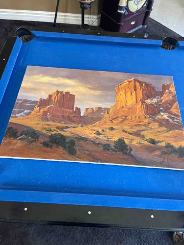 This item is a horizontal rectangular landscape painting depicting a desert canyon scene, reminiscent of Monument Valley or the American Southwest. The artwork is rendered in a representational style, using what appears to be oil or acrylic paint on a canvas or panel substrate. The composition features monumental red rock formations and mesas that dominate the middle ground, illuminated by a warm, golden light suggestive of sunrise or sunset. Small patches of white, possibly representing snow or highlights on the rock, are visible in the crevices. The foreground consists of arid, sloping terrain dotted with various dark green desert shrubs and sagebrush. The sky is filled with soft, hazy clouds reflecting the orange and yellow hues of the sun. In terms of condition, the artwork is shown unframed, resting on a blue surface. The edges appear somewhat irregular, suggesting it may have been removed from a frame or a larger roll of canvas. There is no visible signature or maker's mark in the lower corners, though it may be obscured by the angle. The craftsmanship shows professional skill in color theory and atmospheric perspective. Based on the style and subject matter, it likely dates from the late 20th century to modern times, as part of the Western American art tradition.