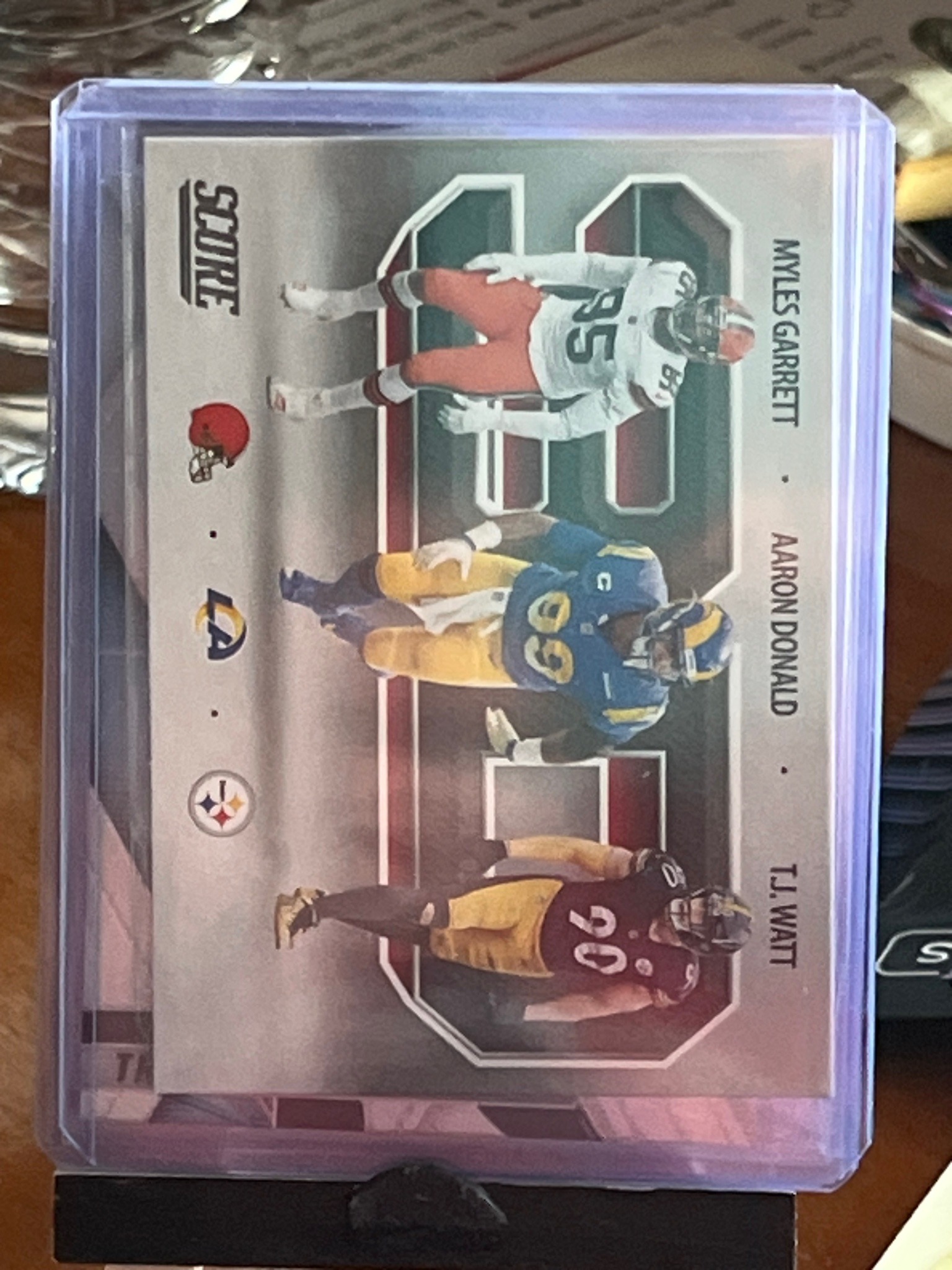 2021 Panini Score 'Sack Attack' Myles Garrett, Aaron Donald, and T.J. Watt Football Trading Card