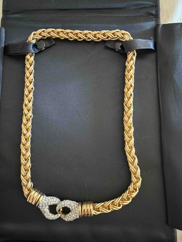 This is a substantial vintage-style collar or choker necklace featuring a thick woven wheat (spiga) chain construction. The piece is crafted from a bright, polished yellow gold-tone base metal, possessing a heavy, high-quality aesthetic typical of high-end costume jewelry from the 1980s or 1990s. The focal point is a decorative front-facing clasp consisting of two interlocking 'C' or stirrup-shaped motifs, which are densely pavé-set with clear round-cut rhinestones or crystals. These jeweled elements are connected to the main chain by ribbed or fluted gold-tone end caps that provide a clean transition. The overall condition appears excellent with no visible tarnishing, missing stones, or significant wear to the gold plating. The craftsmanship is evident in the tightness of the chain weave and the precise setting of the crystals. While no maker's mark is immediately visible in the photograph, the design language is reminiscent of luxury fashion houses such as Dior or Chanel from the late 20th century. The necklace is presented on a black velvet or satin jewelry display folder, suggesting it has been well-maintained as a collectible accessory.