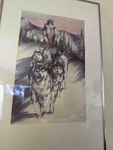 This item is a contemporary framed print, likely a lithograph or high-quality giclee, depicting a traditional sled dog team and musher in a winter landscape. The artwork features five Siberian Huskies or Alaskan Malamutes in the foreground, rendered with detailed linework in black and grey, contrasting against a soft, pastel-toned background of mountains and pine trees. The musher is seen in the upper center, dressed in heavy arctic furs. The color palette is composed of muted blues, lavenders, and pinks in the sky, reflecting a dawn or dusk lighting. The piece is professionally matted with a clean white border and housed in a thin, contemporary silver-toned metal frame behind glass. It appears to be signed and numbered in the lower right corner, although the specifics are obscured by glare, suggesting it is a limited edition piece from the late 20th century. The condition of the visible print appears excellent, with no signs of foxing or water damage, though there is a minor reflected glare on the glass surface. The composition demonstrates high-level illustrative craftsmanship, particularly in the expressive faces and anatomical accuracy of the dogs.