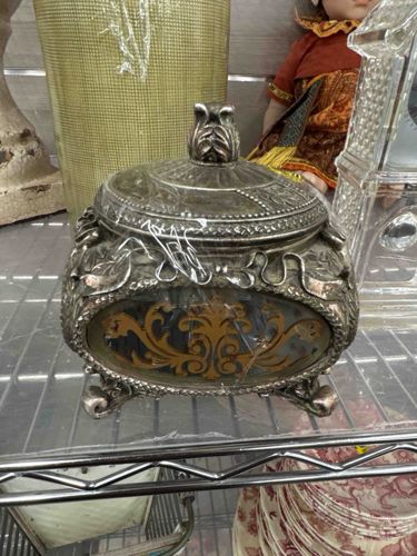This is a decorative, vintage-style trinket or vanity box with a bulbous, oval-shaped body and a matching domed lid. The item is constructed from a cast metallic material, likely a zinc alloy or pot metal, finished in a tarnished or antiqued silver-tone patina. The exterior is heavily ornamented with Victorian-insipired scrollwork, beaded borders, and ribbon-and-bow motifs. A central feature is a curved glass window on the front face, decorated with an interior amber-colored filigree or decal depicting a scroll-like crest. The box sits atop four small, scrolled feet. The lid is topped with an ornate finial which appears to be a stylized leaf or bud. In terms of condition, the metal shows significant surface oxidation and darkening consistent with age or a manufactured 'shabby chic' aesthetic. The glass insert appears intact, though the interior decal shows signs of fading or minor peeling. There is clear evidence of plastic cling-wrap around the lid area, likely for protection during transport or secondary sale. This piece likely dates from the late 20th century, imitating late 19th-century Neo-Rococo aesthetics.