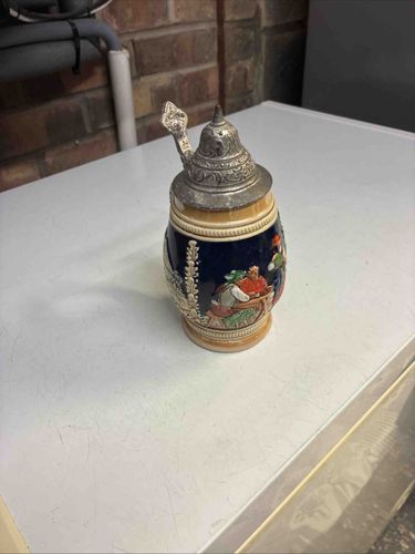 This is a traditional German-style lidded beer stein featuring a relief-molded ceramic body and a decorative metal lid. The body of the vessel is characterized by a deep cobalt blue glazed background, which serves as a canvas for high-relief polychrome figures depicted in a rustic tavern or 'Biertisch' scene. The figures are dressed in traditional folk attire, including green hats and red vests, showing a high degree of molded detail. The upper and lower bands of the stein exhibit a natural stoneware color with molded architectural or foliate patterns. The lid appears to be made of pewter or a similar zinc-based alloy, featuring an ornate domed shape with a pointed finial and an embossed floral or scrollwork design. A decorative thumb lift is attached to the hinge mechanism, used for opening the lid with one hand. The condition shows moderate aging, particularly visible in the heavy oxidation and patina on the metal lid, which has dulled to a dark grey. There are no immediate signs of large cracks or chips on the ceramic body from this angle, though fine crazing in the glaze may be present. This style is consistent with mid-to-late 20th-century souvenir production often found in the Westerwald region or through manufacturers like Gerz or Thewalt. The combination of salt-glazed stoneware aesthetics with modern color application suggests it was produced for the collector or tourist market rather than as a museum-grade antique from the 19th century.