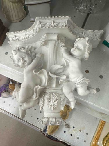 This item is a decorative wall sconce or shelf bracket featuring two figural putti (cherubs) flanking a central ornamental column. The piece is constructed from a cast material, likely resin or a heavy composite plaster, finished in a matte off-white or cream coloration. The design exhibits Neoclassical and Baroque influences, with the cherubs portrayed in dynamic, flowing poses with draped fabric elements. The top of the bracket features a flat shelf surface with a crenelated or dentil-molding style edge and fleur-de-lis accents. The central pillar is decorated with acanthus leaf motifs at the base and top. In terms of condition, the piece shows surface dirt and minor scuffing consistent with shelf wear. There appear to be some small chips along the delicate edges of the cherubs' fingers and the drapery, which is common for cast composite items. While no maker's marks are visible in the photograph, the style and construction suggest a late 20th-century mass-produced decorative object intended to mimic antique carved stone or heavy plaster architectural salvage. The craftsmanship is of standard commercial quality with moderate detail in the facial features and hair of the figures.