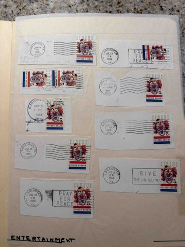 This collection consists of nine envelope snippets featuring the 1966 United States 5-cent Circus commemorative stamp (Scott #1309). The stamps depict a stylized clown face based on a design by artist Edward Cassel, intended to honor the American circus. Each stamp displays a red-haired clown with a blue and white striped background, featuring 'CIRCUS' at the top and 'UNITED STATES' at the bottom. These stamps have been clipped from original correspondences, retaining their mechanical postmarks. Notable cancellations include circular date stamps from Lancaster, Levittown, Christiana, and Gordonville, Pennsylvania, dating through July 1966. Variations in the postmarks are present, including 'Pray for Peace' slogan cancels and 'Give the United Way' box cancels. The condition is varied; while the stamps themselves appear intact with vibrant primary colors (red, white, and blue), the surrounding paper displays irregular hand-cut edges and some light toning. One snippet shows pencil notations of pricing or inventory numbers. The stamps are mounted on a cream-colored album page labeled 'ENTERTAINMENT' in black marker at the bottom. This group represents a specialized interest in postal history and topical circus philately from the mid-20th century.