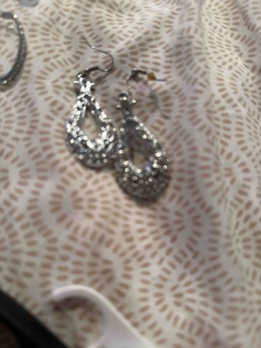 This is a pair of costume jewelry drop earrings featuring a distinctive open teardrop or pear-shaped silhouette. The earrings are constructed from a silver-toned metal, likely a base metal alloy such as brass or pewter with a polished rhodium or silver plating. The design showcases an ornate filigree openwork pattern, which is densely encrusted with numerous small, round-cut clear crystals or glass rhinestones. These stones are pavé-set across the front surface of the teardrop to enhance light reflection and sparkle. The earrings utilize a 'fishhook' or French hook style wire for attachment, which appears to be integrated into the top decorative bail of the drop component. Both earrings show a consistent texture and finish. Regarding condition, while the image is slightly out of focus, the plating appears intact without obvious signs of heavy tarnish or green oxidation (verdigris). All visible stones appear to be present, though a closer inspection would be required to confirm no minor losses in the pavé setting. There are no visible maker's marks or stamps identifying a specific designer or metal purity, suggesting these are mass-produced fashion jewelry items likely dating from the early 21st century. The craftsmanship is typical of contemporary boutique fashion accessories intended for evening wear or formal occasions.