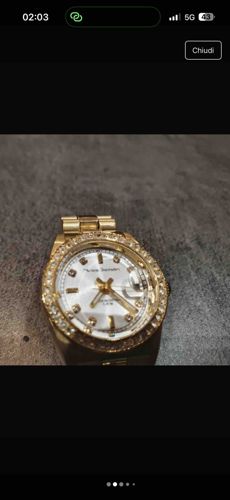 This is a contemporary gold-tone entry-level fashion watch designed to mimic the aesthetic of high-end luxury timepieces. The watch features a gold-colored circular case and a matching link bracelet. The prominent bezel is encrusted with small, clear rhinestones or crystals, a common decorative element in fashion jewelry. The dial is silver or white with a sunray finish, featuring baton-style hour markers and gold-tone hands. A magnifying 'cyclops' lens is visible over the date window at the 3 o'clock position, a stylistic choice popularized by Swiss luxury brands. The brand name printed on the dial appears to be a fashion label rather than a traditional horological manufacturer. In terms of condition, the item shows moderate surface wear, consistent with light use; there are visible micro-scratches on the metallic surfaces and potentially some oxidation or plating wear near the lugs. The overall craftsmanship suggests a mass-produced item from the late 20th or early 21st century, prioritized for style over mechanical complexity. The movement is likely quartz, which is standard for this tier of accessory. The setting of the stones appears to be a basic pavé or glue-in style, typical of fast-fashion accessories.