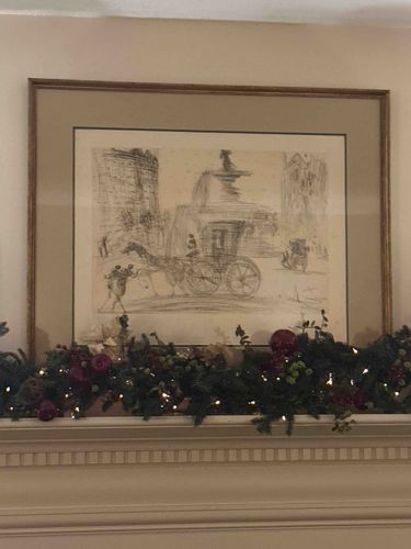 This item is a large-format, framed sketch depicting a bustling urban scene, likely New York City, featuring a horse-drawn hansom cab in the foreground with architectural figures and a second carriage in the background. The artwork is rendered in a loose, gestural style using what appears to be graphite, charcoal, or lithographic crayon on light-colored paper. The composition is centered and showcases a sophisticated use of line to convey movement and atmosphere. The artwork is professionally matted with a thick, tan-colored border and set within a decorative gilded wood frame. The frame features a fine beaded or fluted texture and a warm metallic finish. Based on the subject matter and style, this piece likely dates from the mid-20th century, capturing a nostalgic view of city life. The craftsmanship is high, indicated by the precise matting and protective glazing. Regarding condition, the artwork appears well-preserved within its frame, though the paper shows a slight natural age-toning. No significant foxing, moisture damage, or tears are visible from the present view. The frame exhibits minor surface patina consistent with age. There are no visible signatures or maker's marks from this distance, but they may be present under the matting.