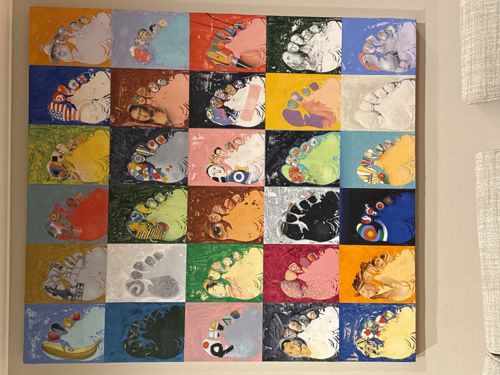 This is a large-scale contemporary mixed media or acrylic painting on canvas, attributed to the artist Giavanopolis. The composition is structured in a strict 5x6 grid, totaling 30 distinct rectangular cells. Each cell features a stylized representation of a human footprint, executed in various vibrant color palettes and incorporating unique internal graphics. The colors range from saturated primary tones like blue, red, and yellow to softer pastels and monochromatic grays. Notable features include the integration of iconographic elements within the toe and heel regions of the prints, such as flags, faces, and abstract patterns, reminiscent of Pop Art or Neomodernist styles. The construction appears to be high-quality stretched canvas, though the frame is not visible. The physical condition looks excellent with no apparent surface abrasions, flaking, or structural damage. The craftsmanship is characterized by clean lines between the grid sections and a consistent application of pigment, suggesting a late 20th-century or early 21st-century production date. The repetitive yet varied nature of the motif serves as a study in seriality and identity.
