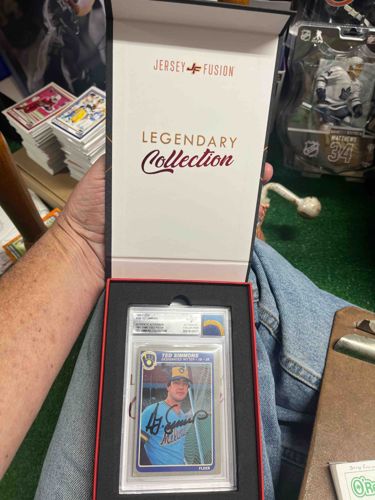 This item is a premium sports collectible featuring a Ted Simmons 1982 Fleer baseball card, part of the Jersey Fusion 'Legendary Collection.' The card itself depicts Simmons in his Milwaukee Brewers uniform, featuring a bold blue color palette and the classic 1980s Fleer design. A significant feature is the authentic on-card autograph signed in black ink across the player's image. The card is professionally encapsulated in a high-quality clear plastic slab, which includes a certification label from Jersey Fusion at the top, detailing the authenticity of the autograph and the 'Legendary Collection' status. The entire slab is housed within a red and black custom presentation box lined with dense grey foam, specifically die-cut to fit the graded holder. The lid of the box is white with gold and maroon lettering that reads 'Jersey Fusion Legendary Collection.' The condition of the card appears to be excellent based on its protected state, with sharp corners and vibrant color, while the signature is clear and well-defined without smudging. This modern luxury packaging aims to elevate vintage sports cards into high-end memorabilia pieces, combining the nostalgia of the 1982 Fleer set with the contemporary value of certified autographs and archival protection.