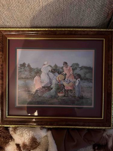 This item is a medium-sized framed art print depicting a pastoral scene of several African American figures, primarily women and children, engaged in outdoor activity in a meadow or field setting. The artwork is rendered in a soft, impressionistic watercolor or gouache style with muted pastel tones including pink, soft green, and white. The composition features figures in sunhats and traditional early 20th-century attire, suggesting a nostalgic or historical folk art theme. The piece is professionally mounted with a multi-layered matting system, featuring a deep burgundy outer mat accenting the colors of the subjects' clothing. The frame is a traditional wide-profile wood molding with a dark mahogany or walnut stained finish, highlighted by a thin gold-toned inner fillet and perhaps a gold beaded outer edge. The glass appears to be standard non-glare or clear picture glass. The overall condition looks good with no visible tears or foxing to the print itself, though there are minor reflections on the glass surface indicating it is not museum-grade anti-reflective glass. The style suggests a late 20th-century contemporary print designed for home decor, evoking the school of artists like Jonathan Green or similar American genre painters focusing on rural life and heritage.