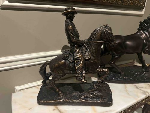 This is a cast metal sculpture, likely bronze or bronze-plated spelter, depicting a lone cowboy astride an alert horse in a traditional Western realist style. The figure is dressed in classic itinerant cowboy attire, featuring a wide-brimmed Stetson-style hat, a neckerchief, a long-sleeved shirt, and trousers tucked into boots with visible stirrups. The horse is portrayed in a dynamic stance, with one front leg lifted as if navigating rocky or uneven terrain, which is integrated into the sculpted rectangular base. The craftsmanship displays heavy texturing, particularly in the horse's musculature and the rough-hewn surface of the terrain, designed to catch light and create deep shadows. The piece exhibits a dark brown patina with golden-bronze highlights appearing on the high-relief areas, such as the horse's flank and the rider's shoulder, consistent with age-related wear or intentional 'cold painting' techniques common in mid-20th-century Western decorative arts. Notable details include a meticulously rendered saddle, bedrolls, and bridle. While no maker's mark is immediately visible in this view, the style is reminiscent of works by Frederic Remington or his contemporaries, though likely a later 20th-century reproduction or inspired piece. The overall condition appears stable with expected surface oxidation and minor dust accumulation in recessed areas.