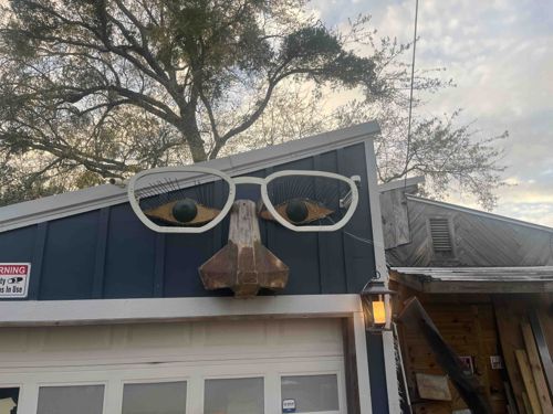 This unique outdoor installation consists of a large-scale, multimedia sculptural arrangement mounted on the facade of a shed or garage. The piece features a pair of oversized, white-painted eyeglass frames that serve as the focal point. Situated behind and within these frames are two almond-shaped eyes constructed with prominent, dark circular pupils and detailed with long, black bristle-like eyelashes that extend upward, suggesting a whimsical or folk-art aesthetic. Below the glasses is a carved wooden nose with a geometric, faceted construction, showing a naturally weathered, brown patina. The materials appear to be a mixture of painted wood, metal, and perhaps industrial bristles. The installation is mounted against a dark blue siding board-and-batten background, creating a strong visual contrast. The craftsmanship is bespoke and exhibits characteristics of outsider or site-specific vernacular art. Condition-wise, the wood shows significant weathering and silvering consistent with long-term exposure to the elements, and the white paint on the frames appears flat and potentially prone to chalking. No maker's marks are visible, and the style suggests a contemporary, late-20th or early-21st-century creation designed to add personality and humor to a functional structure.