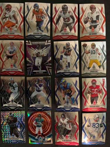 This is a collection of 16 modern American football trading cards from the Panini Phoenix brand, featuring a mix of base cards, rookies, and special inserts. The cards are standard size (2.5 x 3.5 inches) and constructed from heavy cardstock with a distinctive high-gloss, metallic foil finish. The set includes notable players such as Joe Burrow (Bengals), C.J. Stroud (Texans), and Jordan Love (Packers). The design is characterized by sharp, geometric 'X' patterns that frame the action photography of the athletes. Many cards feature bright red or blue color-matched borders respective of team colors. Notable inserts include a purple 'Thunderbirds' C.J. Stroud card and a circular patterned 'Paragon' Travis Hunter card with a vibrant rainbow refractive finish. The bottom left card features a 'Lava' or 'Cracked Ice' parallel texture on an Aidan Hutchinson card, adding significant visual depth. The overall condition appears to be 'near-mint' to 'mint,' showing sharp corners and clean edges with no visible surface scratches or creases. Each card prominently displays the Panini Phoenix logo, player name, and team affiliation. Based on the player roster and design elements, this collection appears to be from the 2023 or 2024 production cycles.