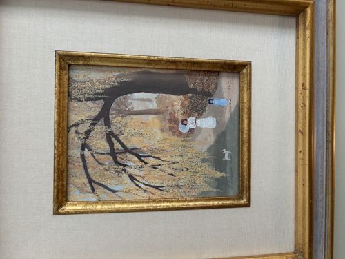 This rectangular framed painting is an original artwork, likely executed in gouache or oil on panel or paper, featuring a serene landscape scene. The composition depicts figures in Victorian-era attire, including a woman in a long white dress with a parasol and children in blue, strolling through a wooded parkland with a large tree in the foreground. The style is distinctly naïve or folk-art influenced, characterized by simplified forms and a pointillist-inspired application of paint for foliage in shades of gold, brown, and ochre. The artwork is signed 'J. Labrousse' in the lower-right corner. It is housed within a complex presentation consisting of a narrow gilded wood inner fillet, surrounded by a wide cream-colored linen or fabric-covered mat, all contained within a tiered gold-leaf frame. The frame displays a slight aged patina with minor scuffs and characteristic cracking of the gilt known as craquelure, suggesting a mid-to-late 20th-century production intended to evoke an earlier period. The overall condition appears excellent with no visible fading or water damage to the artwork or mounting fabric. The craftsmanship demonstrates high-quality professional framing, enhancing the piece's decorative appeal.