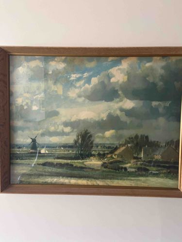 This item is a framed landscape print, likely a lithograph or high-quality art reproduction, depicting a pastoral European scene under a dramatic, cloud-heavy sky. The composition features a foreground of rolling fields leading toward a small cluster of stone-style cottages on the right and a traditional windmill on the left horizon. The color palette is dominated by muted greens, ochres, and deep blues within the voluminous Cumulus clouds, suggesting an Impressionist or Post-Impressionist influence, possibly in the style of early 20th-century British or Dutch landscape artists. The artwork is housed in a mid-century style wooden frame with a visible grain, possibly oak or teak, featuring a thin gold-toned inner fillet that adds a touch of elegance. The print appears to be protected by glass, which shows significant light reflection in the lower-left corner of the photograph. Regarding condition, the frame appears structurally sound with minor scuffing typical of age. The print itself shows no immediate signs of moisture damage or fading, though there is a faint vertical light streak on the left side which may be a glass reflection or a slight crease in the paper. The overall aesthetic suggests a mid-20th-century production intended for home decor, emulating classical oil painting techniques with broad, atmospheric brushwork.