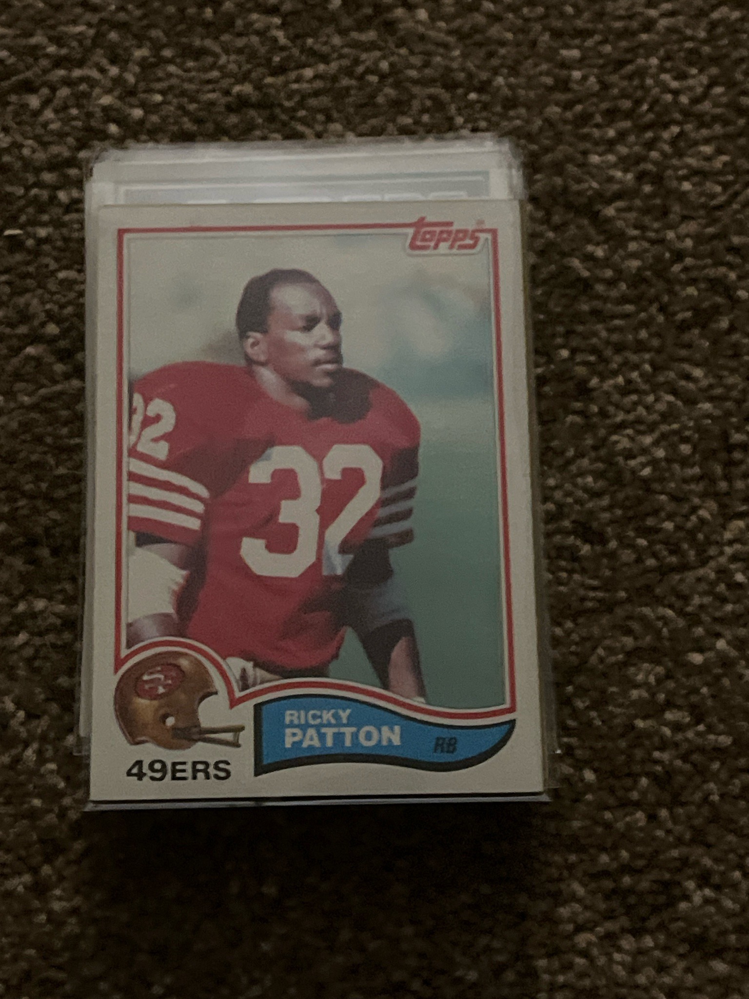This is a 1982 Topps football card featuring Ricky Patton (Running Back) of the San Francisco 49ers. The card measures standard trading card size (2.5 by 3.5 inches) and is printed on standard cardstock. The design features a color photograph of Patton in his red and white 49ers jersey with number 32 visible. Notable design elements include the red 'Topps' logo in the upper right, a red border framing the image, and a distinctive 'helmet' graphic in the lower left featuring the 49ers logo. Centered at the bottom is a blue swoosh-style banner containing the player name 'RICKY PATTON' and position 'RB'. This specific card appears to be housed in a clear protective sleeve and/or top loader among a stack of other cards. Regarding condition, from the photograph the centering appears slightly shifted to the left and bottom. The corners show some minor softening, which is common for this 1980s era of cardstock. The print quality is consistent with the early 1980s mass production, showing typical ink saturation. There are no major visible creases or surface indentations through the protective layer, though slight edge wear is visible on the bottom white border. This card is part of the 1982 Topps set, which is highly sought after by collectors primarily for the Joe Montana and Lawrence Taylor rookie cards.