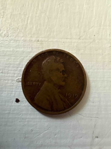 This is a United States one-cent coin, commonly known as a Wheat Penny, dated 1919. The coin features the bust of Abraham Lincoln on the obverse designed by Victor David Brenner. It is composed of 95% copper and 5% tin and zinc, measuring 19.05mm in diameter with a plain edge. The coin exhibits a deep chocolate brown patina consistent with a 'Brown' designation in numismatics. Regarding condition, the piece shows significant signs of honest circulation and environmental exposure; the high points of Lincoln's hair and cheek are heavily smoothed, and the legends 'IN GOD WE TRUST' and 'LIBERTY' appear soft but remain legible. The date '1919' is clearly visible in the lower right field. There is a lack of a mint mark below the date, indicating it was struck at the Philadelphia Mint. Notable condition issues include numerous small surface contact marks, a darkening of the fields due to oxidation, and some minor rim bruising. Despite the heavy wear, the iconic silhouette and essential motifs of early 20th-century American coinage are preserved. This specimen represents a common date in the series, produced shortly after World War I, and carries the historic 'Wheat Ears' reverse design (implied by the series type).