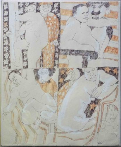 This original work of art is a four-panel composite drawing executed on paper, likely using pen, ink, and colored markers or pencils. The composition features a variety of figures, many of which appear to be nudes, intertwined with stylized background patterns including floral motifs, stripes, and stars. The artwork is dominated by a warm palette of oranges, browns, and neutral skin tones, all delineated with strong black ink outlines. Each of the four quadrants presents a different scene, often pairing a more realistically rendered human figure with a caricature or masked character, such as the clown-like figure in the upper left or the bird-masked figure in the lower right. Physically, the work is protected under glass within a thin, silver-toned frame. Notable features include a signature or inscription in the bottom right corner that appears to read 'J. J. Rucker' followed by 'April 1982'. The style is reminiscent of Outsider Art or figurative expressionism from the late 20th century, characterized by its flattened perspective and raw, illustrative quality. In terms of condition, the paper shows mild yellowing consistent with an age of approximately 40 years, and there is a slight ripple in the paper near the bottom right corner, suggesting potential minor moisture exposure or tension within the framing. The craftsmanship indicates a purposeful, hand-drawn aesthetic that prioritizes narrative and symbolic juxtaposition over classical proportion.