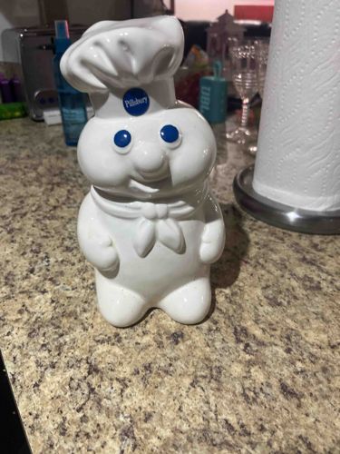 This is a vintage ceramic cookie jar depicting the iconic 'Poppin' Fresh' Pillsbury Doughboy advertising mascot. The piece is constructed from heavy ceramic with a high-gloss white glaze finish. The figure is shown in his classic pose, wearing a tall chef's hat featuring the blue and white 'Pillsbury' logo disk, and a knotted kerchief around his neck. The character has large, round blue eyes and a smiling expression. Physically, the jar appears to be approximately 10 to 12 inches tall, consisting of two main parts: the head (which serves as the lid) and the body (the storage base). The construction shows smooth molded details typical of mid-to-late 20th-century kitchenware. This specific design was produced by several manufacturers under license, most notably Benjamin & Medwin or potentially McCoy, dating likely from the 1980s or 1990s. In terms of condition, the exterior glaze appears bright and well-preserved, though some minor dark spots or manufacturing firing dots are visible near the legs. There is no immediate evidence of large cracks or chips in this view, though such items are prone to light crazing of the glaze over time. The craftsmanship is commercial-grade, designed for both decorative kitchen use and snack storage, making it a highly collectible piece of Americana advertising memorabilia.