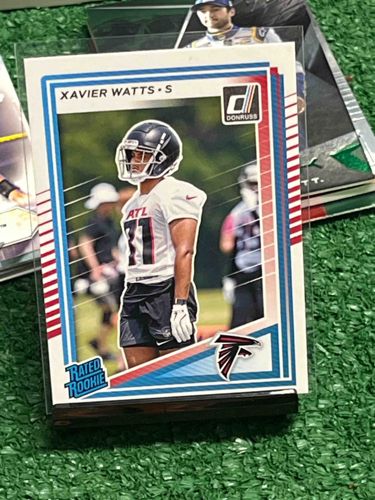 This is a modern sports trading card featuring American football player Xavier Watts, positioned in his safety (S) role for the Atlanta Falcons. The card is part of the iconic 'Donruss' brand set, specifically featuring the 'Rated Rookie' logo in the bottom-left corner, a hallmark of Panini America's Donruss product line. The card features a standard rectangular trading card construction with a glossy front finish. The design incorporates a white border with a multi-layered geometric frame in blue and red. The central image shows Watts in a practice uniform (white jersey with 'ATL' and number 31, black shorts, and helmet) against a soft-focus background of a practice field. The upper right contains the classic Donruss 'D' logo, and the bottom right features the Atlanta Falcons team logo. The player's name, 'XAVIER WATTS • S', is printed clearly at the top. The card is housed within a transparent protective plastic top-loader sleeve, which helps preserve the integrity of the corners and edges. Visually, the card appears to be in excellent condition with sharp corners and clean edges, though an official grade would require professional assessment for micro-wear and centering. The color saturation is vibrant, and the typography is crisp, indicating high-quality modern manufacturing. This item represents the contemporary era of NFL licensed collectibles, typically produced within the last 1-2 years.