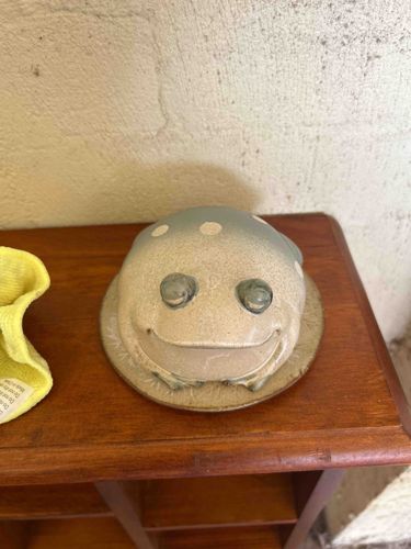 This is a hand-crafted studio pottery figurine depicting a stylized, smiling frog sitting atop a circular base that resembles a lily pad. The piece is constructed from stoneware or a similar heavy ceramic material, featuring a matte finish with a subtle speckled or granular texture throughout the clay body. The frog exhibits a color palette of muted neutral tones, including beige and taupe, with a decorative slate-blue or sage-green wash applied across its back and highlight points like the protruding eyes. Large, light-colored circular spots are painted across the dorsal area to represent typical frog markings. The face is characterized by a wide, incised smile and two large, bulbous eyes that give the piece a whimsical, anthropomorphic quality. The frog is integral to a flat, circular base which features faint incised details around the perimeter, suggesting the veins of a leaf. While no maker's mark is clearly visible from the top-down perspective, the style is consistent with mid-to-late 20th-century decorative art pottery. The condition appears sound with no visible cracks or major chips, though there is a natural aged patina to the unglazed portions of the clay. The craftsmanship indicates it was likely a small-production or unique artisan piece rather than mass-produced cast-ware.
