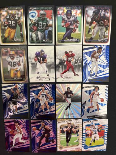 This is a diverse collection of 16 modern sports trading cards, featuring players from both the National Football League (NFL) and the National Basketball Association (NBA). The collection showcases various high-end manufacturing techniques, including the Topps Chrome series known for its distinctive metallic, refractor-like finish and vibrant team-specific borders. Notable NFL players represented include Dorsey Levens, Santana Moss, Shaun Alexander, and Rod Smith from the early 2000s, as well as modern stars like Derek Carr. The NBA portion features recent stars such as Cade Cunningham, captured in dynamic 'Revolution' and geometric-pattern parallel versions. Physically, the cards exhibit standard dimensions of 2.5 by 3.5 inches. The materials range from traditional cardboard stock with glossy coatings to premium chrome-based synthetic substrates. Construction features include die-cut elements, holographic foil stamping, and intricate geometric background patterns that suggest various levels of rarity or 'parallels' (e.g., blue and purple fractured patterns). The condition appears to be generally good, though several cards show signs of lateral curvature (bowing or 'warping'), which is common in chrome-finished cards due to humidity-sensitive coating layers. Some surface scratches and minor edge wear are visible under close inspection. The set spans roughly two decades of production, from approximately 2000 to the mid-2020s, featuring brands like Topps, Prestige, Panini Absolute, and Panini Revolution.