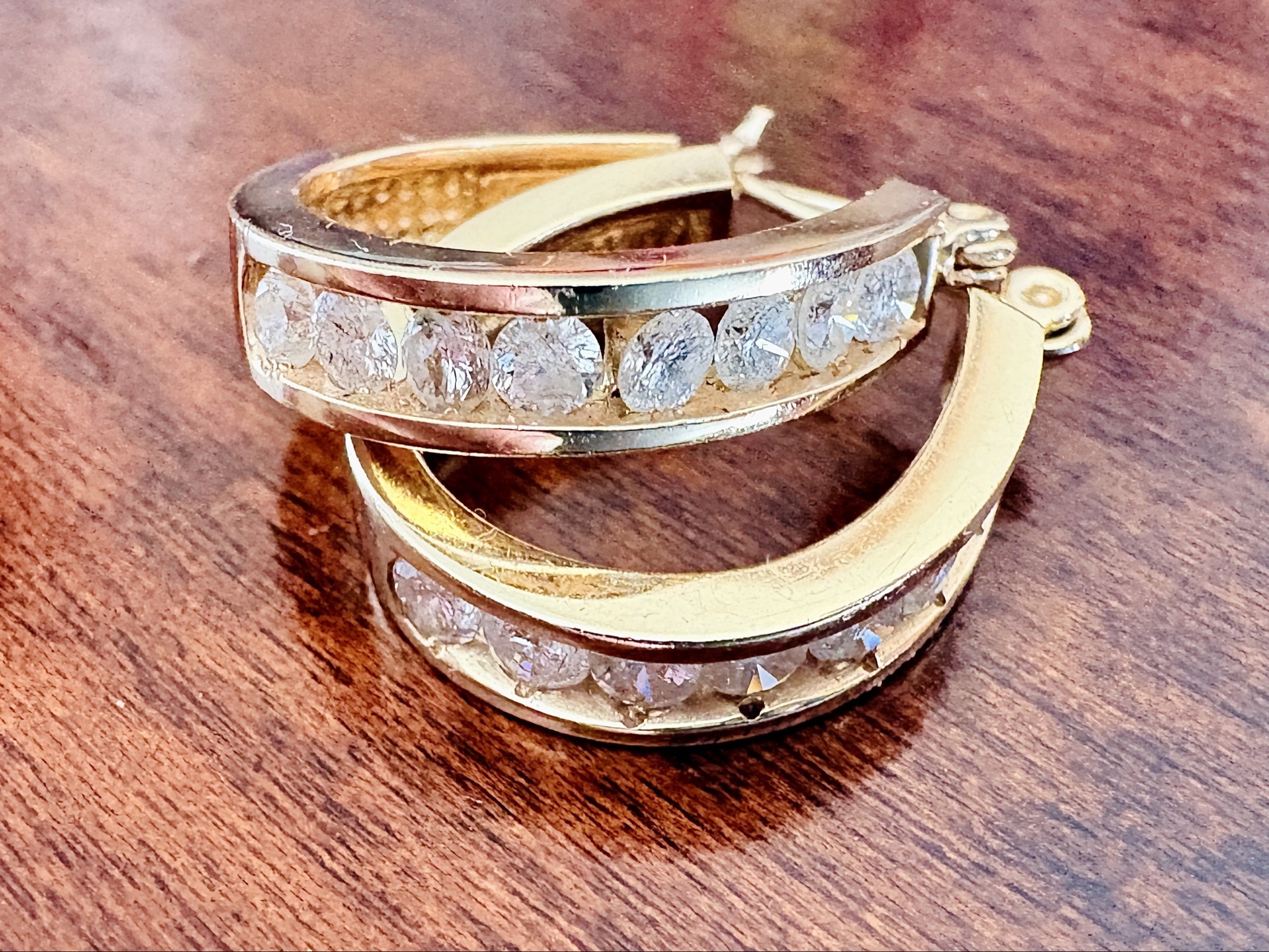 A matching pair of small-to-medium sized hoop earrings, approximately 20-25mm in diameter, featuring a channel-set row of round brilliant-cut colorless stones. The stones exhibit high luster but visible internal fractures and surface abrasions, suggesting they are likely cubic zirconia or glass rather than diamonds. The earrings are constructed from a yellow gold-tone metal, which shows visible wear, flaking, and oxidation on the interior surfaces, indicating a plated finish rather than solid gold. The design features a thicker, tapering profile with a squared-off front face that holds the stones securely between two parallel metal rails. The closure mechanism is a hinged 'huggie' or saddle-back style with a curved post that snaps into a notched catch. Notable condition issues include significant tarnishing and loss of plating on the inner band, as well as accumulated grime behind the stones, which dulls their brilliance. No discernible maker's marks or hallmarks are visible in the provided image. The style is contemporary and mass-produced, likely dating from the late 20th to early 21st century.