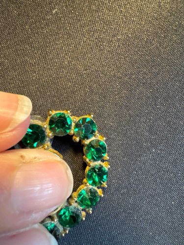 This item is a piece of vintage costume jewelry, specifically a brooch or pin featuring a circular or curved design set with vibrant emerald-green rhinestones. The stones are faceted, round-cut glass, likely simulating emeralds. They are held in place by a gold-tone metal setting, which appears to be base metal with a thin gilded finish. Each stone is secured with a four-prong or six-prong setting, a common construction technique in mid-to-late 20th-century costume jewelry. The metal shows significant signs of age and wear, with visible oxidation and tarnish appearing as dark, crusty buildup between the stones and on the prongs. The gold plating has thinned or worn away in several areas, revealing a duller metal underneath. The glass stones themselves appear relatively clear with some surface scratches and minor dulling, typical of vintage rhinestones. There is no visible maker's mark or signature on the front, suggesting it may be an unsigned piece from a mass-market manufacturer of the 1950s-1970s. The craftsmanship is utilitarian, focused on decorative sparkle rather than fine jewelry precision, as evidenced by the somewhat uneven prongs and the accumulation of environmental debris in the crevices of the setting.