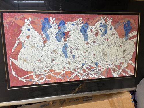 This artwork is a large-format etching with extensive hand-applied gold leaf by the renowned French artist Guillaume Azoulay, likely titled 'Cinco Caballos' or a related piece within his equine series. The work features five highly stylized, intertwined horses rendered in Azoulay's signature linear technique, where complex, overlapping curved lines create a sense of frantic kinetic energy and volume. The color palette is dominated by a rich terracotta or rust-red background, contrasted by the white bodies of the horses, cobalt blue accents, and intricate gold foil detailing throughout the manes and bodies. The piece demonstrates high-quality craftsmanship, specifically the artist's ability to maintain structural form through a seemingly chaotic web of linework. Physically, the artwork is presented in a horizontal rectangular format with distinctive deckled edges on the paper, suggesting a high-quality heavy-weight rag paper substrate. It is professionally framed with a deep black mat that provides a strong contrast to the warm tones of the print, housed within a metallic gold-toned frame. Notable features include the visible texture of the etching plate and the reflective properties of the gold leaf. Regarding condition, there are visible dark smudges or foxing marks on the lower right and center-left portions of the white horse bodies, which may impact the value and require professional conservation. There is a signature and potentially an edition number visible in the lower center/right margin, typical of Azoulay's work from the late 20th century (circa 1980s-1990s). The overall style is Contemporary Expressionism with a focus on rhythmic movement.
