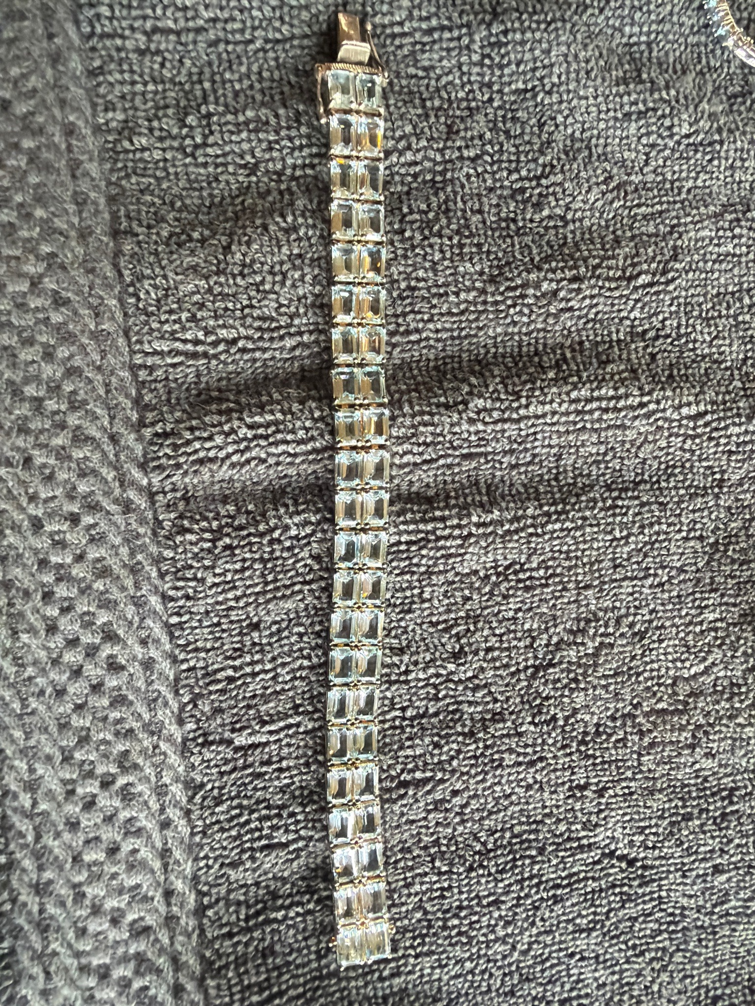 This is a contemporary-style laboratory or commercially-mined gemstone tennis bracelet constructed of .925 sterling silver. The bracelet features approximately twenty-five rectangular emerald-cut gemstones, which appear to be light sky blue topaz or high-quality cubic zirconia, each individually set in a four-prong basket mounting. The stones exhibit a pale, consistent aqua-blue hue with high clarity and typical step-cut facets that create a mirrored hall-of-mirrors effect characteristic of the emerald cut. The bracelet utilizes a series of articulated link connections, allowing for flexibility on the wrist. The closure is a box-style pressure tongue clasp with an additional figure-eight safety latch for added security. While the specific maker's mark is not clearly visible in the top-down view, the metal showcases a polished finish with some visible surface oxidation and light tarnish consistent with sterling silver. The overall craftsmanship suggests a mass-market fine jewelry piece likely dating from the late 20th century to the early 21st century. The condition appears to be excellent with no missing stones or compromised prongs visible from this perspective.