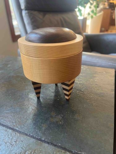 This is a contemporary studio wood vessel, likely crafted by a skilled woodturner or artisan furniture maker. The item is a cylindrical keepsake box standing on three taper-carved feet. The construction demonstrates high-level joinery and material selection, utilizing contrasting hardwoods. The main body and the outer rim of the lid are crafted from a light-colored wood with a subtle grain, such as maple or birch. The lid features a centered, convex dark wood inset, possibly walnut or ebony, creating a tactile and visual focal point. Most notably, the three tripod feet are composed of laminated alternating strips of light and dark wood, resulting in a striking striped pattern that adds a whimsical, post-modern aesthetic similar to the Memphis Group style. The finish appears to be a smooth, low-luster hand-rubbed oil or wax, highlighting the natural grain without a heavy plasticized coating. The condition is excellent, showing minimal signs of wear, no visible cracks in the wood, and a consistent patina. Its design suggests a late 20th-century or early 21st-century origin, emphasizing form and material interplay over functional utility. The precise lamination of the feet and the tight fit of the lid indicate high-quality craftsmanship.