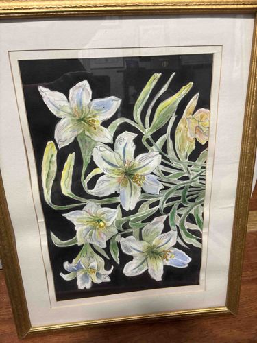This is an original botanical watercolor painting featuring a grouping of white lilies set against a dense, matte black background. The work utilizes a high-contrast palette, with the white petals showing delicate highlights of pale blue and soft green shadows to create dimension. The stamens are rendered in yellow and ochre tones. The composition includes long, slender green leaves and several unopened flower buds, suggesting a late 20th-century or contemporary style. The painting is executed on paper and is professionally presented within a white acid-free beveled mat. It is housed in an ornate, thin-profile gold-toned wooden or composite frame featuring a textured or beaded outer edge. There are no immediately visible artists' signatures or dates on the front of the piece, though one may be concealed by the matting. The condition appears to be excellent with no evidence of foxing, fading, or moisture damage, although there is slight surface dust on the glass and minor wear to the gilt finish of the frame. The use of a black ground is a striking choice that elevates the botanical subject matter into a more dramatic, modern aesthetic, showcasing competent brushwork and a firm understanding of color theory.