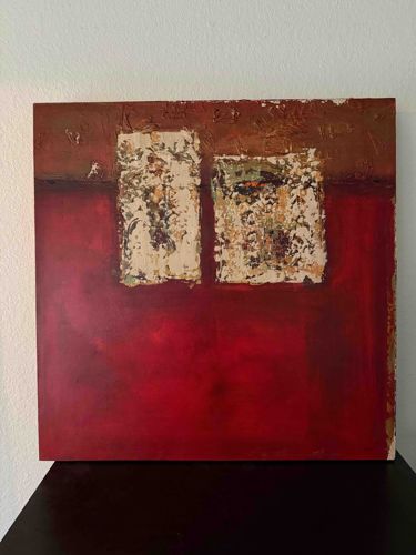 This original mixed media work of art by Penny Peterson measures 32x32 inches and showcases a sophisticated use of texture and color. The composition is divided horizontally into a rich, deep red field occupying the lower portion and a textured, earthy ochre/brick-red band across the top. Centered atop the dividing line are two prominent rectangular 'islands' of heavy impasto and collaged elements, displaying a palette of cream, gold, and dark neutrals. The piece exemplifies a contemporary abstract style, utilizing mixed media techniques that suggest the use of plaster, acrylic, and perhaps fibrous paper to create a tactile, three-dimensional surface. The edges appear purposefully distressed with hints of gold leaf or metallic paint, adding a sense of age and material depth. Created in 2003, the work reflects the artist's focus on geometric balance and organic textures. The craftsmanship is evident in the confident layering and the nuanced shift in red tones. While the signature and date are mentioned in the context (though not clearly visible in the low-resolution front view), the piece appears to be in excellent contemporary condition with no visible cracking or loss to the heavily built-up surface areas.