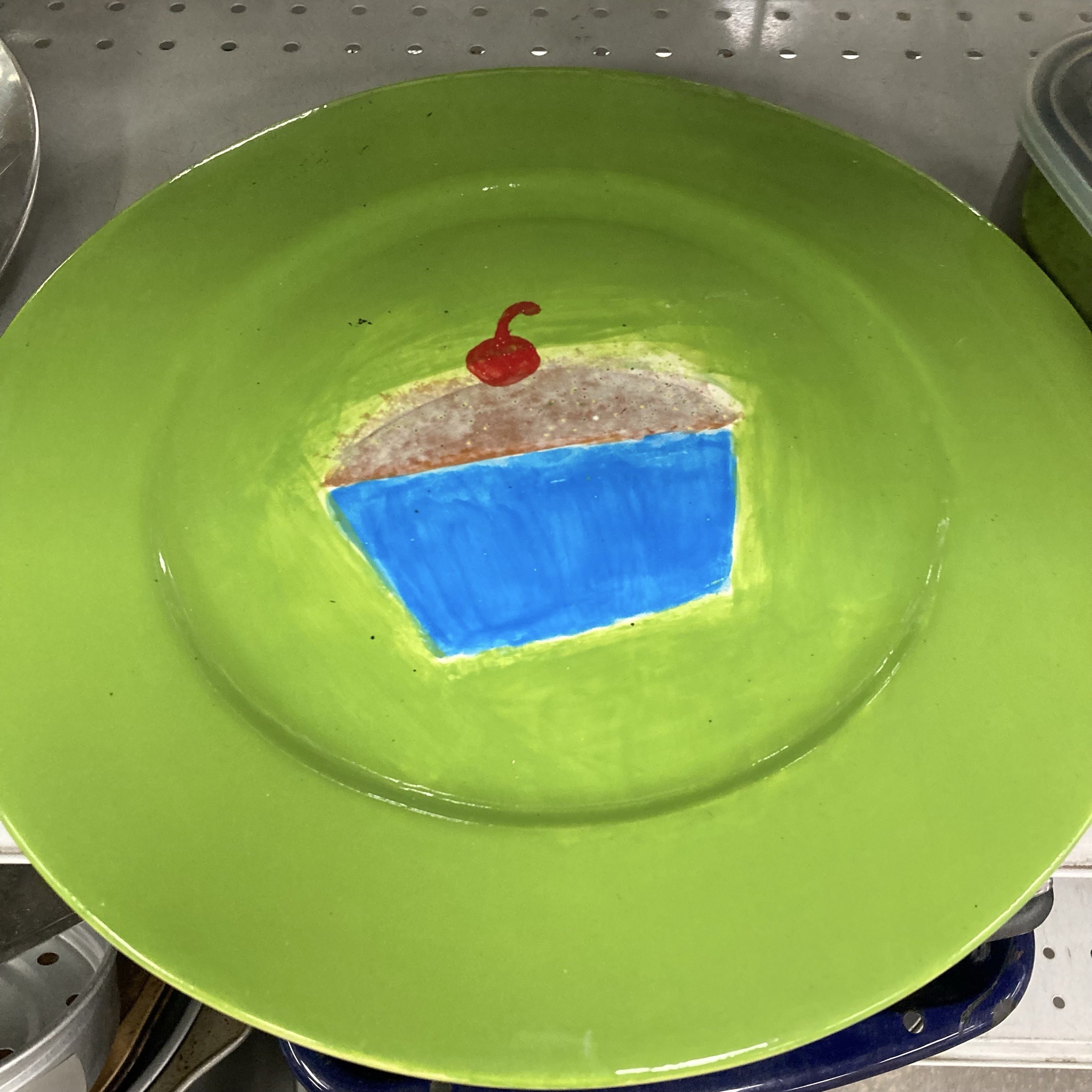 This is a circular ceramic serving plate featuring a vibrant chartreuse or lime green glazed background. The central well of the plate is decorated with a hand-painted depiction of a cupcake, consisting of a solid blue liner, a light brown domed top (resembling frosting or muffin), and a red cherry with a stem perched on top. The artwork exhibits a naive or folk-art style, characterized by visible brushstrokes and slightly irregular borders, suggesting it may have been produced in a paint-your-own pottery studio or as a custom boutique item. The plate appears to be made of heavy earthenware or stoneware with a thick, glossy clear glaze finish. Based on the provided context, the item was produced in 2007 by HDS. Physically, the plate shows a consistent green glaze across the wide rim and base. Notable condition issues include several small dark specks or 'pitting' in the glaze near the cupcake graphic, which may be kiln debris or firing pops. No major chips or cracks are immediately visible, though the surface shows light reflection indicative of a well-maintained glazed finish. The craftsmanship is utilitarian but personalized, reflecting the whimsical kitchenware trends of the mid-2000s.